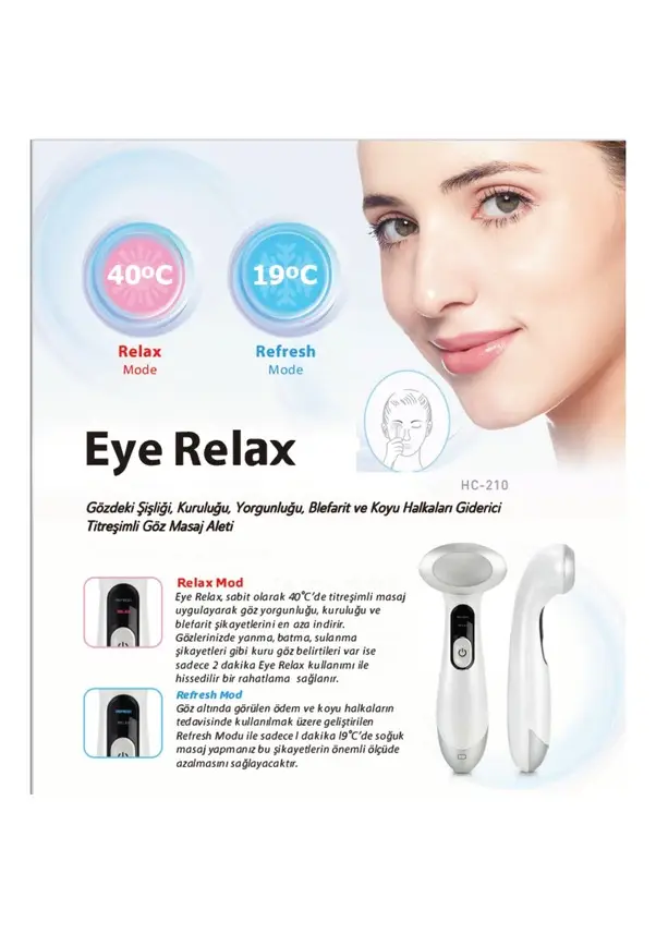 Yorgunluk, alerji, stress veya yaşlanmaya bağlı olarak göz çevresinde oluşan koyu göz altı halkaları ve şişkinlikler çok yaygın olarak görülen bir durumdur. Çoğu zaman göz altı torbalarının da eşlik ettiği göz altı morlukları kişinin olduğundan daha yaşlı görünmesine neden olur. giderici olarak soğuk kompres önerilmelktedir. Soğuk kompres, şişkinliği azaltmaya ve genişlemiş kan damarlarını daraltmaya yardımcı olabilir. Böylece göz altındaki şişkin görünümü azalır ve koyu halkaların belirginliği azalabilir. Eye-Relax Soğuk modu bu semptomların giderilmesi için özel olarak geliştirilmiştir.